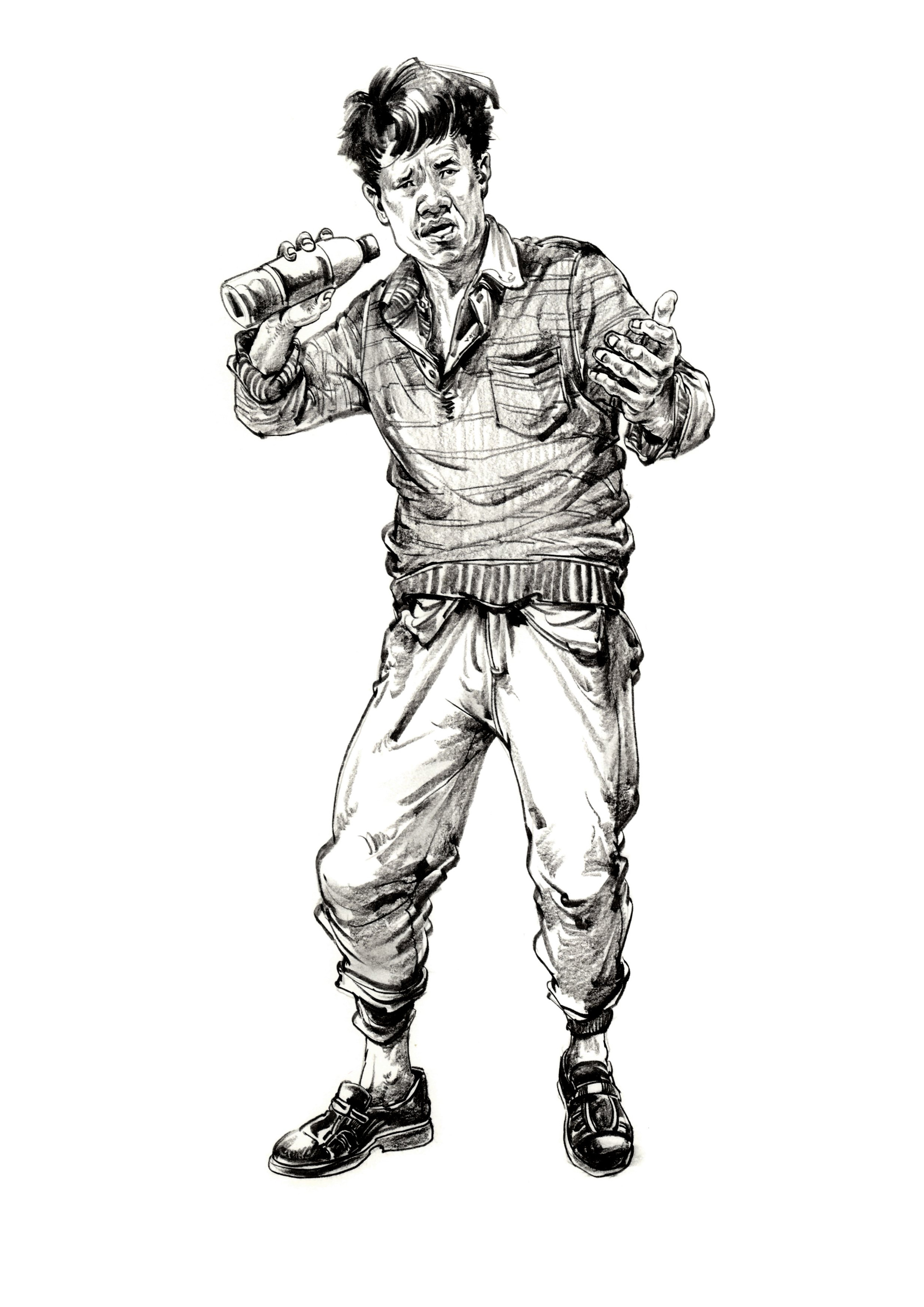 我們對速寫的理解一般都是從簡單到繁雜,簡單也就是對人體結構進行概括,二橫一豎三體積(體塊)四肢,如:頭部、胸腔、胯骨都概括為六面體,四肢概括為粉筆頭。