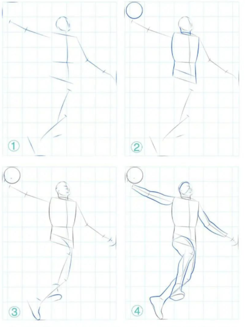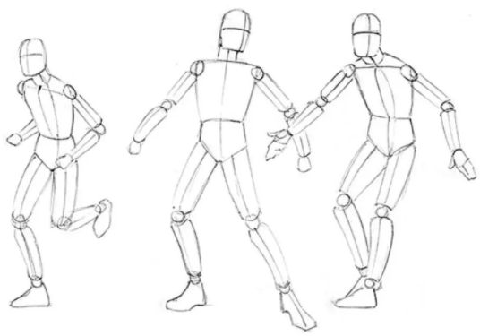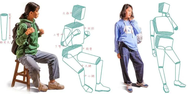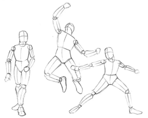 動態:動態是依靠體塊之間的旋轉與四肢關節點處的彎曲轉折產生的。我們可以利用“二橫、一豎、三體積、四肢”概括人體的動態特征。
