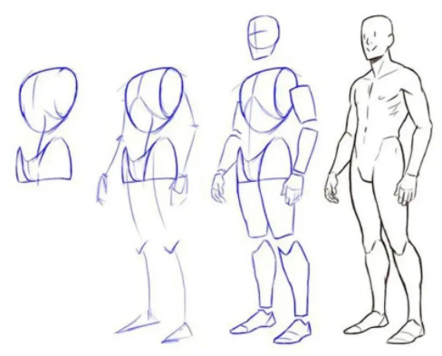 我們常用下面這個方法進行起稿,先畫出大的形狀,在形體的基礎上結合幾何歸納法畫出衣著的不貼肉部分,這樣的目的是讓人物著衣后的形體更加準確。