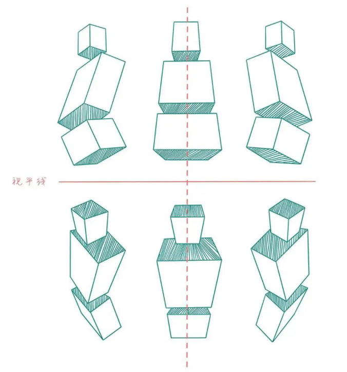 人體的體塊透視變化主要是視平線上與視平線下的人體透視變化和人體與畫面角度的透視變化。繪畫之前我們要先找到視平線的位置,只有視平線在畫面中找的正確,我們才可以確定人體體塊在畫面整體的透視關系,而后確定人體各體塊之間的透視關系,特別是“三體積”的關系。