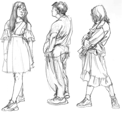 速寫快寫能培養(yǎng)我們敏銳的觀察能力(整體觀察、輪廓觀察),使我們善于捕捉生活中美好的瞬間。速寫快寫能培養(yǎng)我們的繪畫概括能力,使我們能在短暫的時間內(nèi)畫出對象的特征。速寫快寫能提高我們對形象的記憶能力和默寫能力。