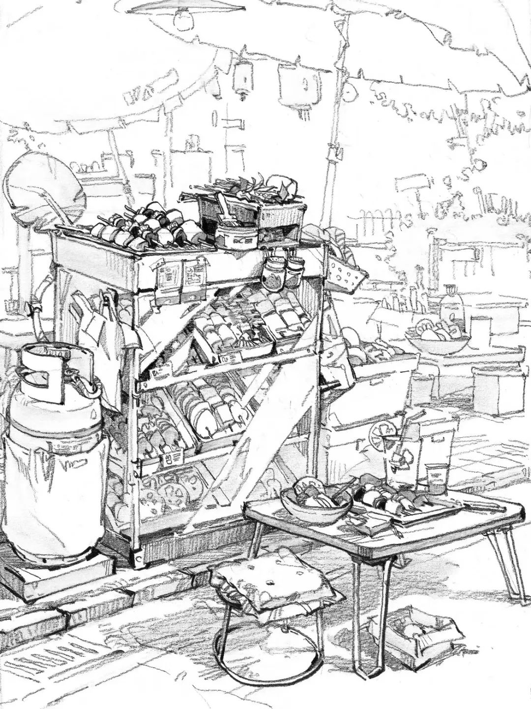 線面為主的速寫場(chǎng)景,在畫(huà)面中,要布局好畫(huà)面黑白灰層次關(guān)系,增強(qiáng)畫(huà)面的氣氛和節(jié)奏感,下圖針對(duì)整幅畫(huà)之間的黑白灰關(guān)系做的解析。