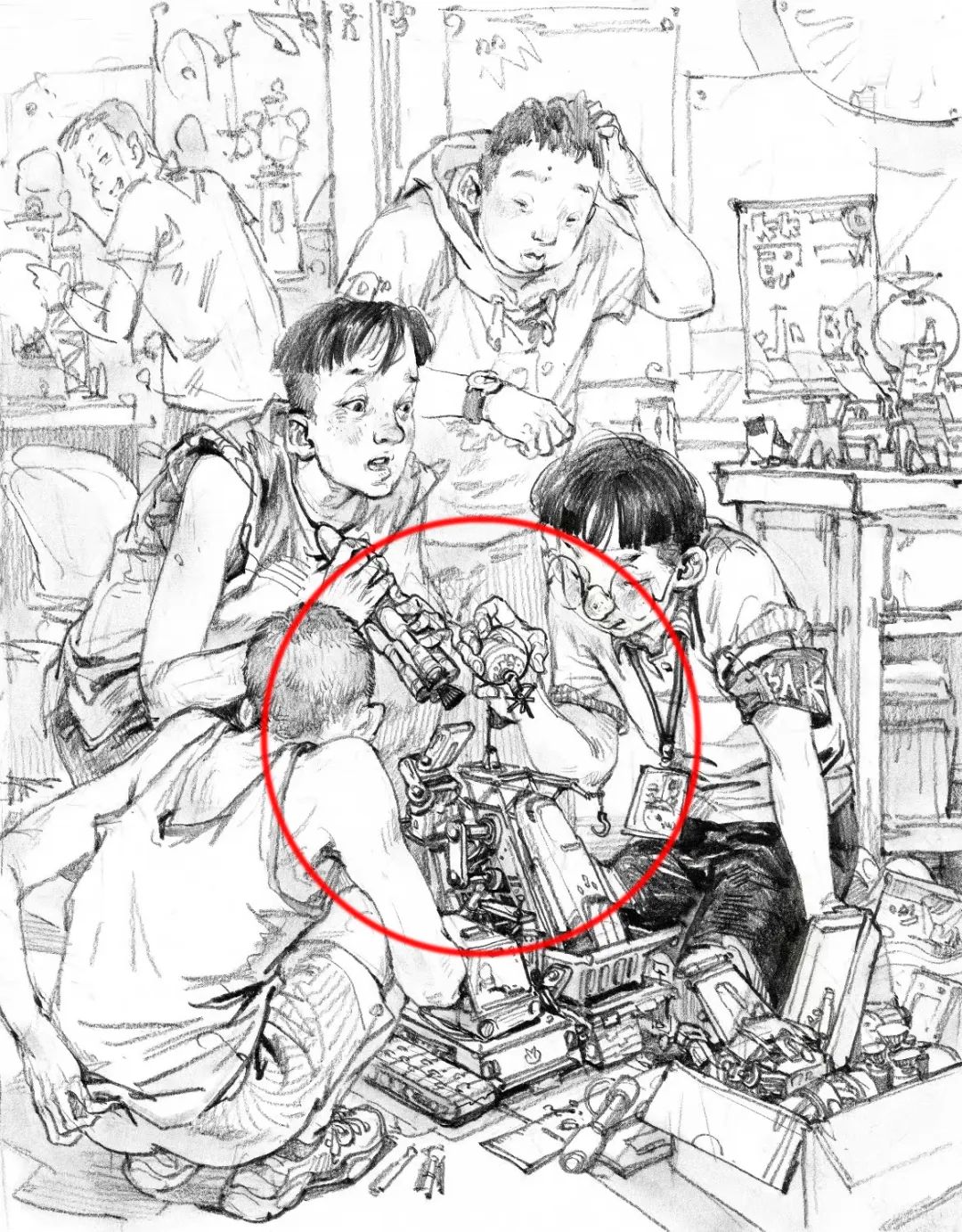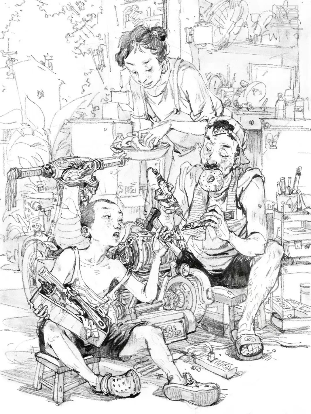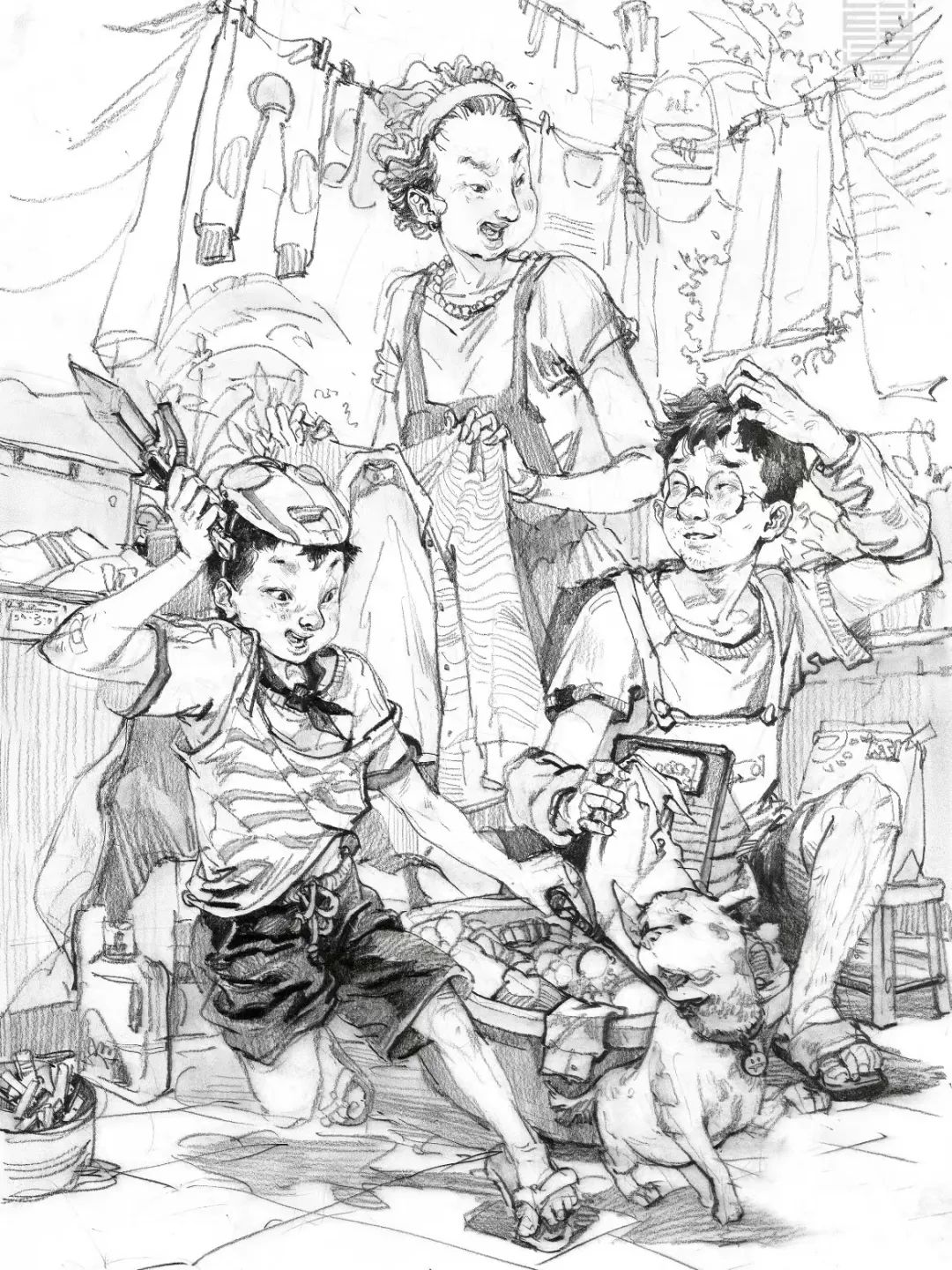 場(chǎng)景中的道具包括各種工具、家具陳設(shè)、人物用品、前景雜物等等。道具可以說(shuō)明人物的身份、環(huán)境、時(shí)間、地點(diǎn),還可以填補(bǔ)畫(huà)面空白,連接、建立人物之間的關(guān)系,調(diào)節(jié)畫(huà)面結(jié)構(gòu)上主與次、前與后、輕與重的節(jié)奏變化。說(shuō)明性的道具描寫要完整、細(xì)致,點(diǎn)綴性的道具可以畫(huà)得比較輕松隨意,但是要控制道具的刻畫(huà)比重,不要超過(guò)主題的分量。