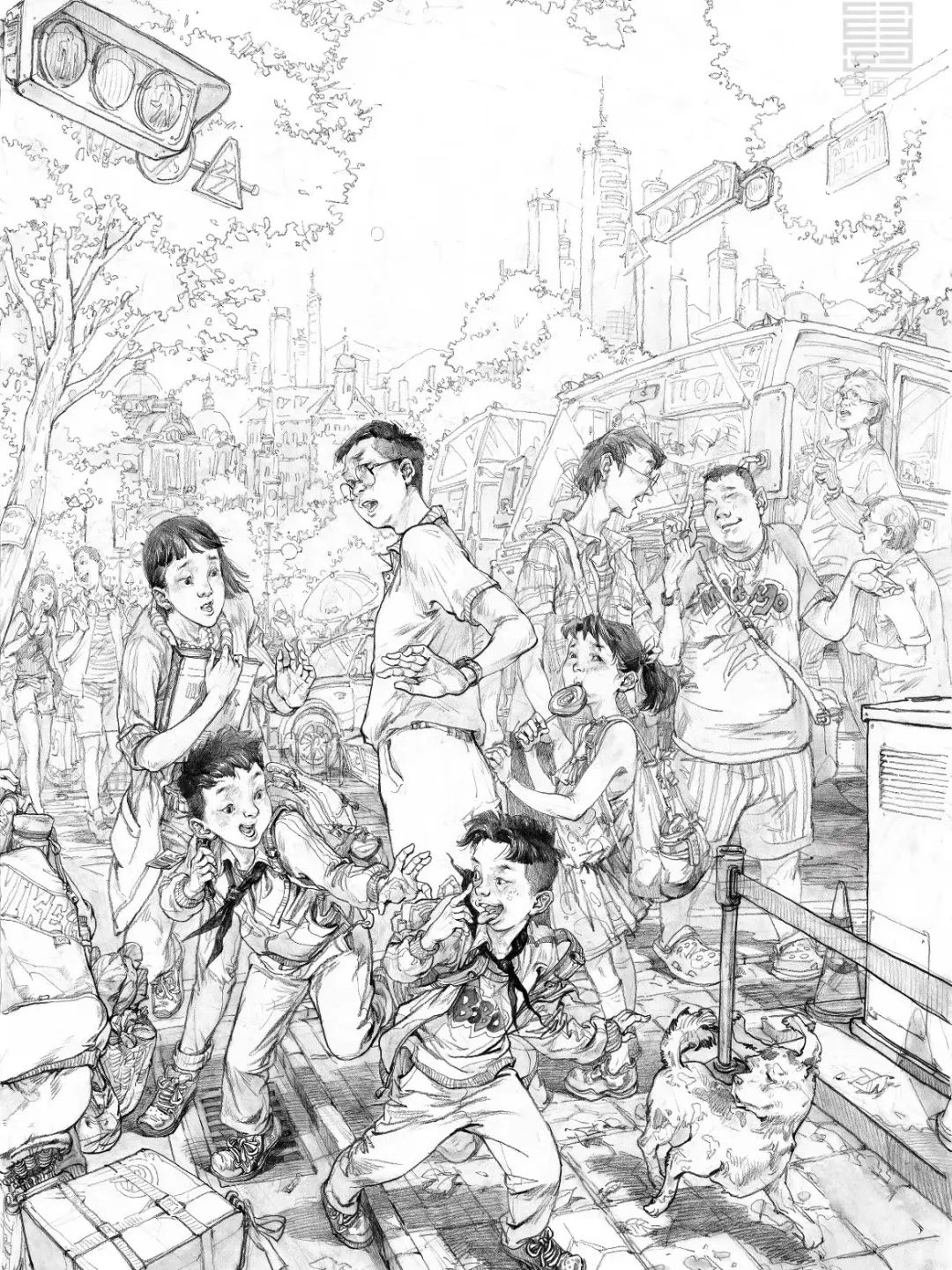 構(gòu)圖是一張畫(huà)的靈魂。場(chǎng)景速寫的構(gòu)圖要在動(dòng)手下筆之前,心中有一個(gè)大體的輪廓。在速寫進(jìn)行中,將對(duì)象逐一安排在預(yù)想的框架中,其中可以根據(jù)畫(huà)面的需要進(jìn)行單個(gè)即興調(diào)整。場(chǎng)景速寫的構(gòu)圖往往是夸張化的,人物占據(jù)畫(huà)面中心。周圍環(huán)繞著場(chǎng)景,生活氣息非常濃厚,就是你隨時(shí)可以在馬路邊看到的街景。