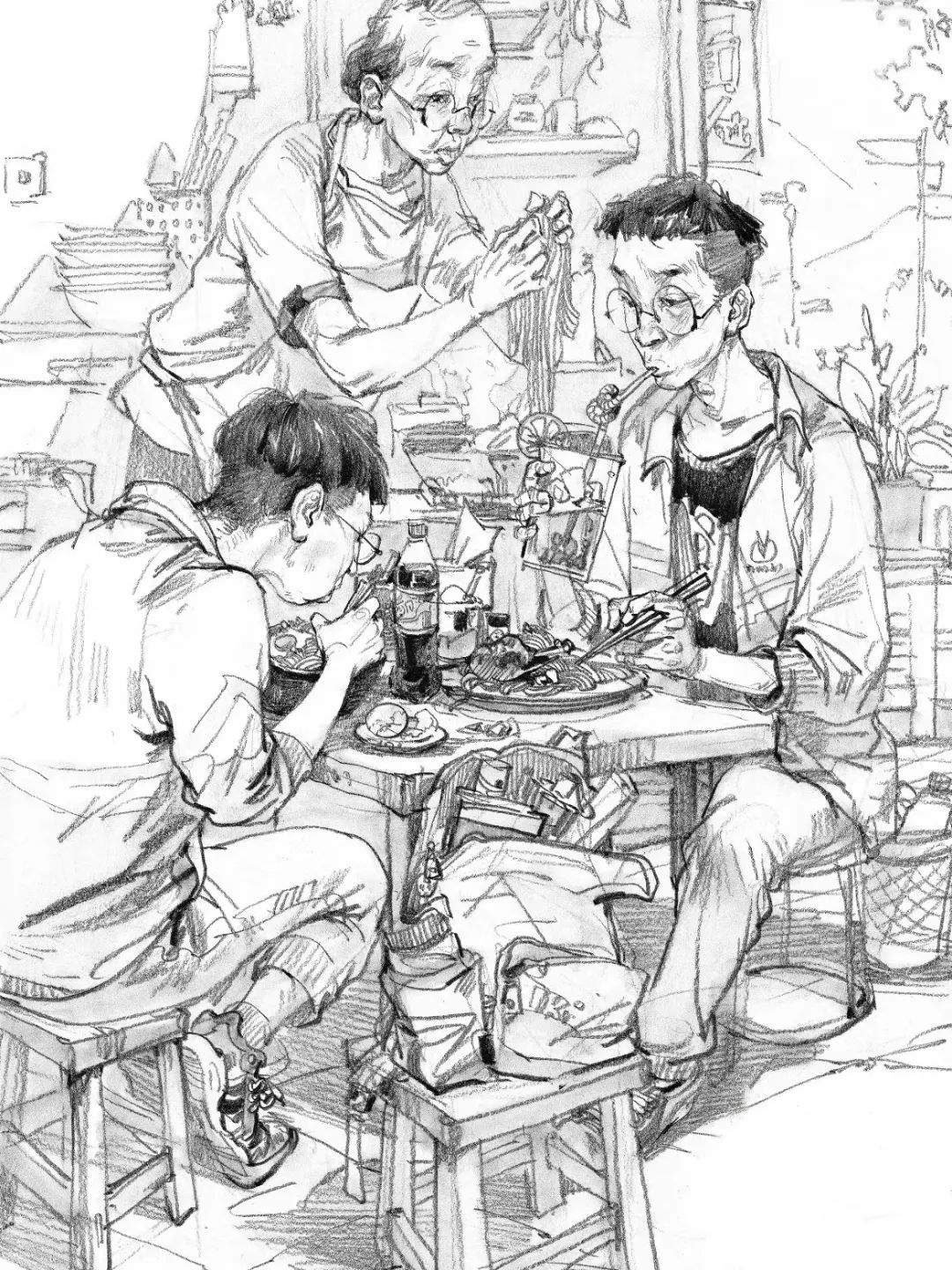 速寫的場(chǎng)景氛圍烘托主要是靠增添多層次、豐富的道具,人物之間的聯(lián)系等來(lái)襯托主體所處的情境,通過(guò)穿插、前后擺放形成一種耐人尋味的構(gòu)成感。想象自己是置身于所畫(huà)場(chǎng)景的第一現(xiàn)場(chǎng),作為記錄者去畫(huà)腦海中所浮現(xiàn)的充滿故事性的畫(huà)面,這樣能夠更精準(zhǔn)地塑造默寫中的場(chǎng)景。