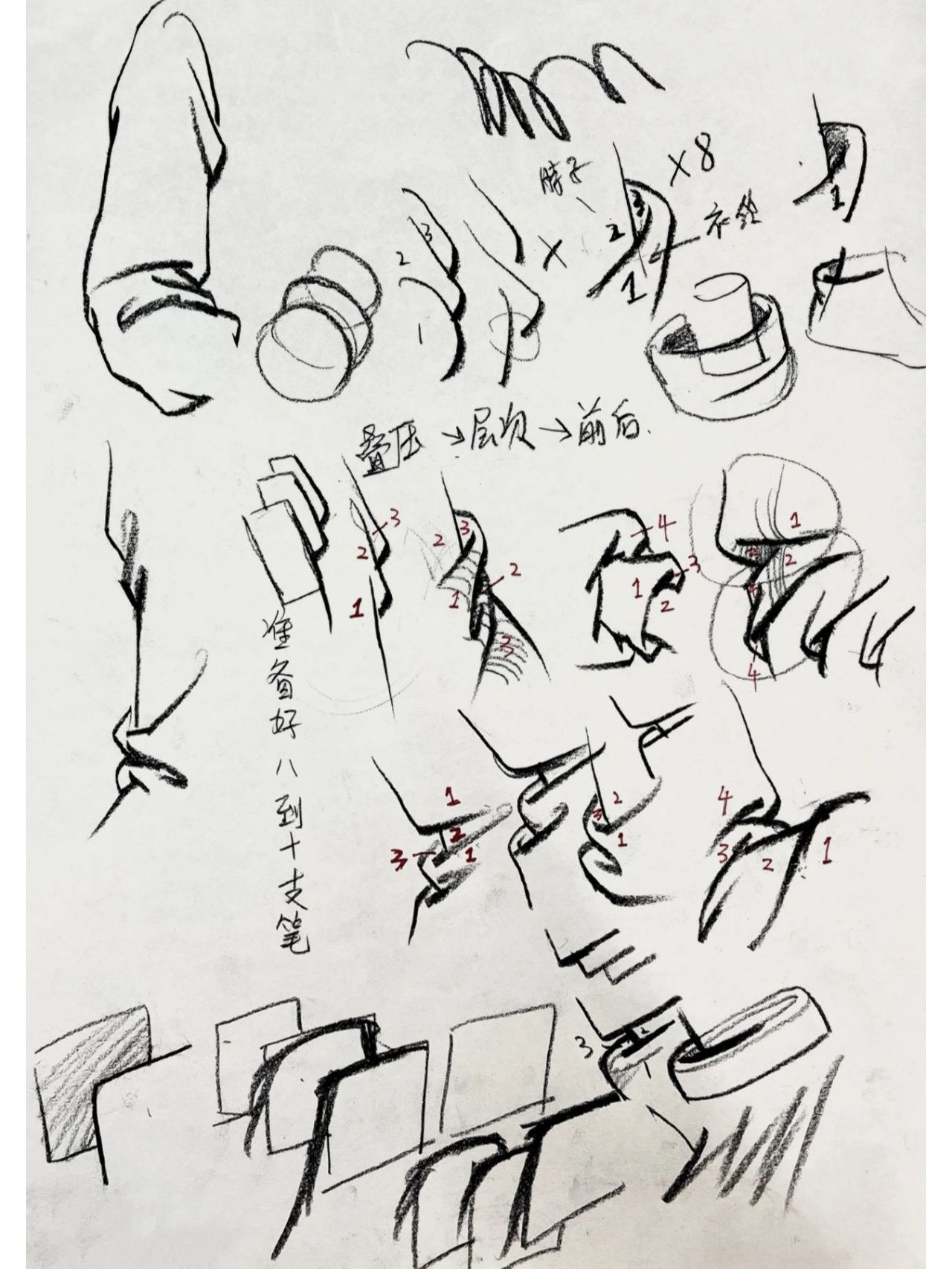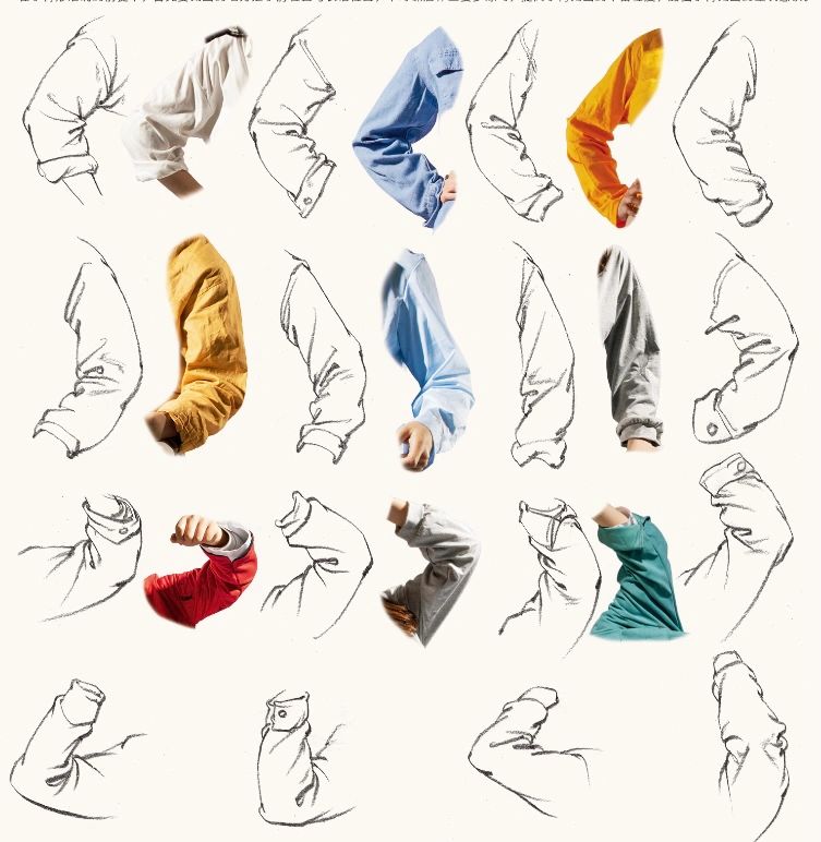2.懸垂褶皺就是在畫素描的時候找兩個支點作為衣物的懸掛點,常見的褶皺膝蓋之間,肩膀之間,肩膀和伸出的手臂之間。