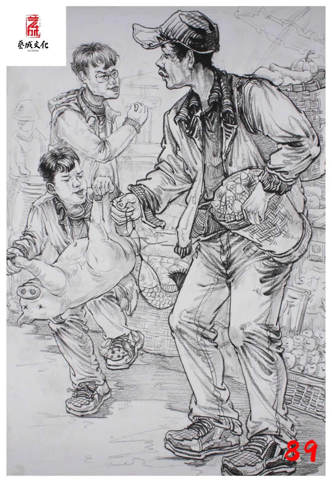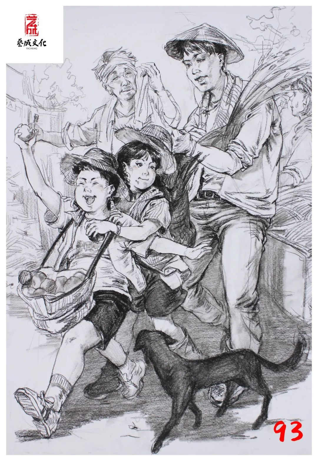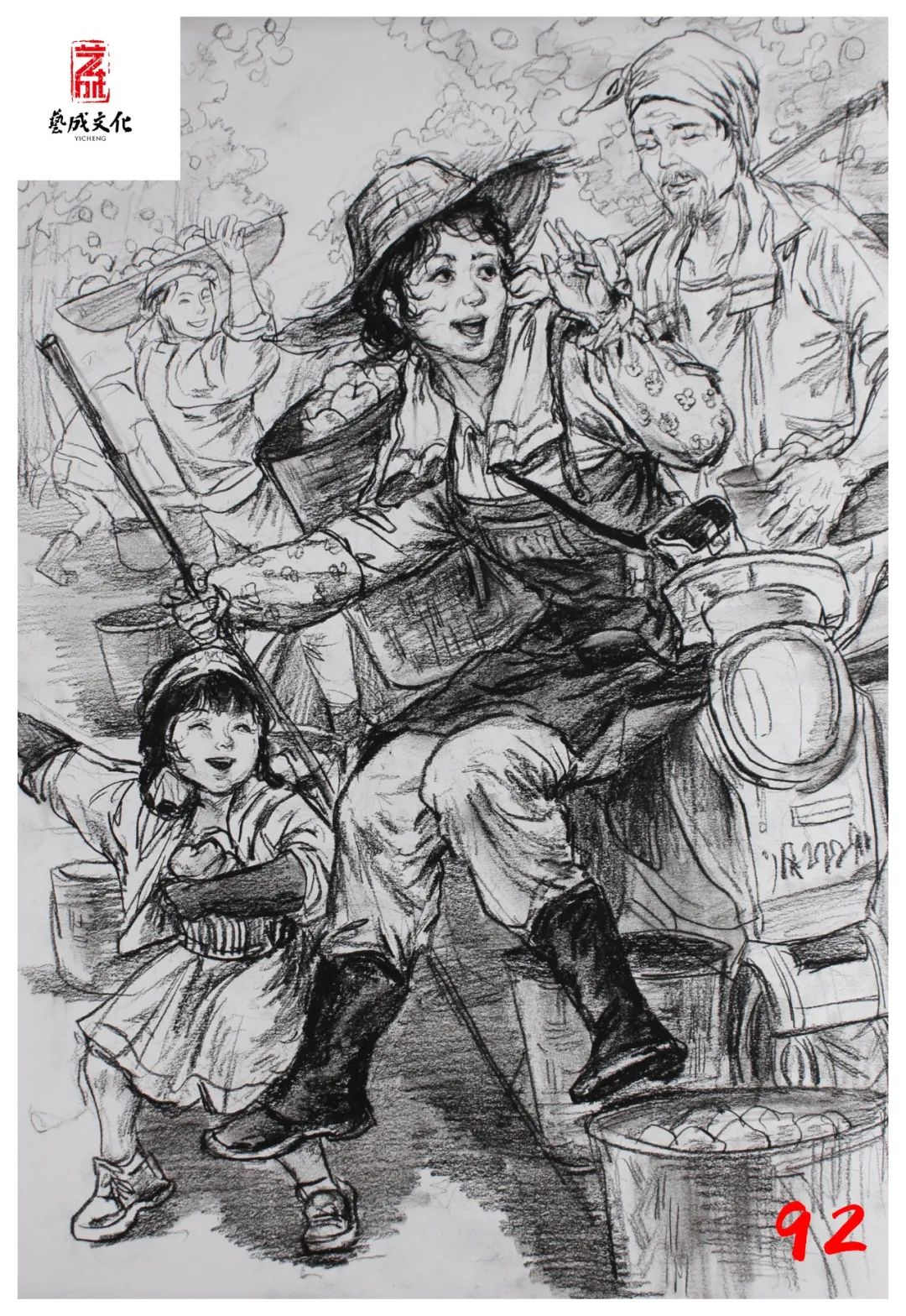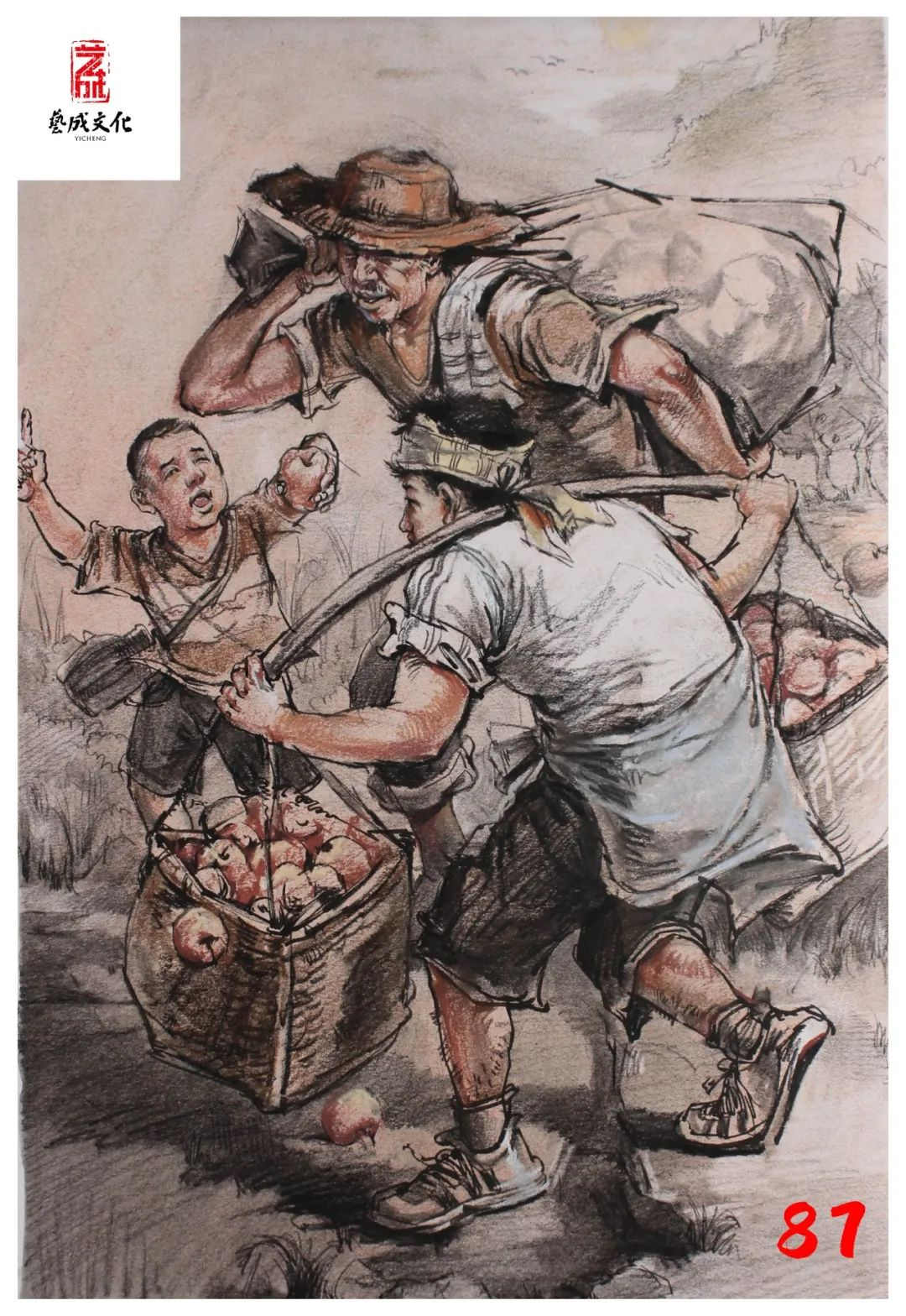 解析:試題要求你創造豐收場景,測試素材中人物的動態比例略有夸張。表現手法與我們的對比草圖略有不同。參考內容較少。主要目標是考驗考生的敏感度和生活記憶能力,人物注重動態比例特征,大量的默寫元素也幫助考生發揮自己的感受和想象力,創作出更好的作品!